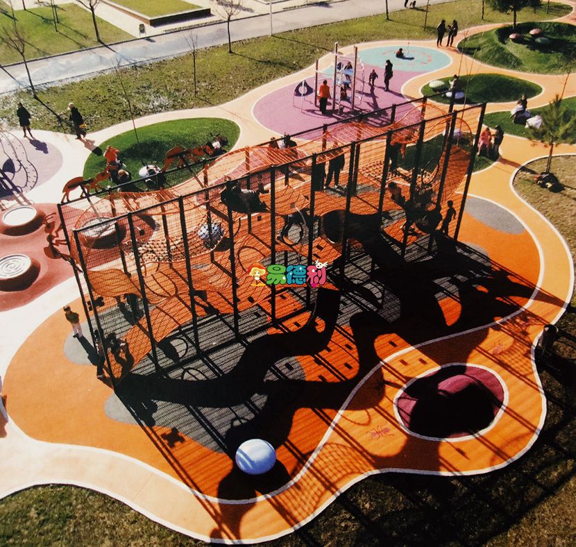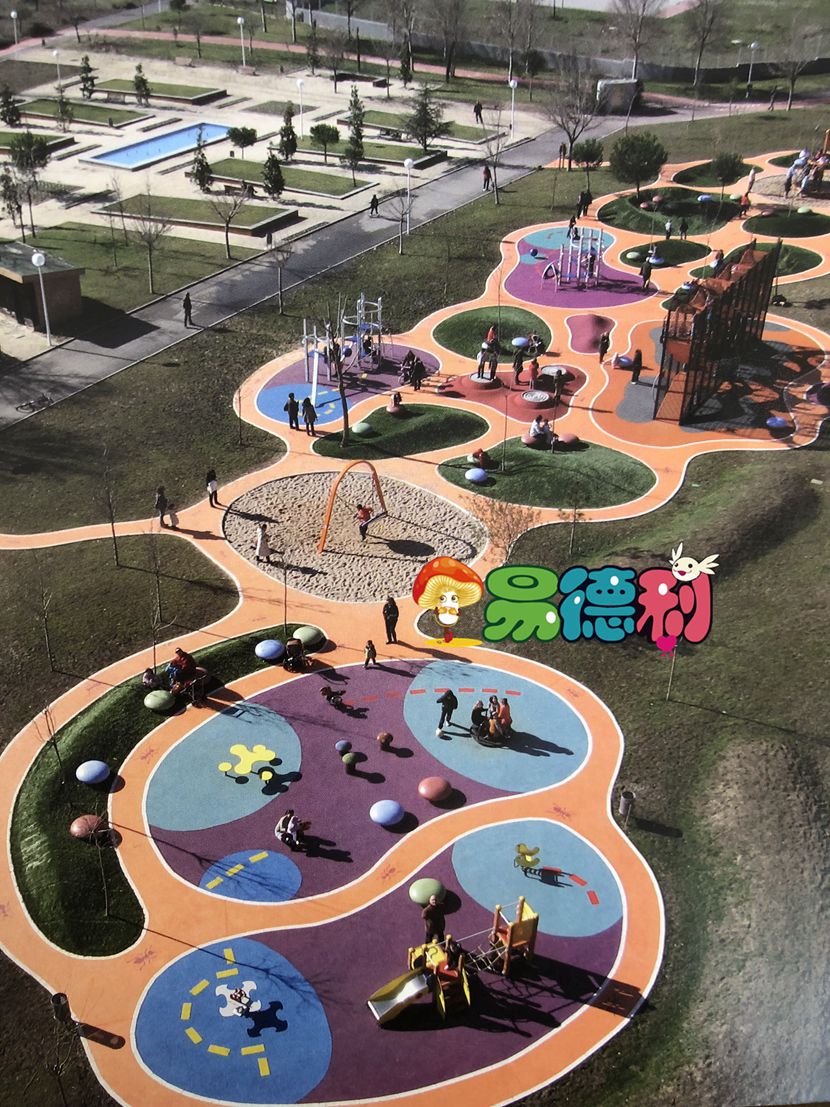 在這個項目中,場地的布局規劃主題是蟻塚。因此,平面圖再現了螞蟻這些昆蟲制造的各種道。可愈有道在游樂場各處都以不同形式呈現螞蟻的形象;在人行道上有螞蟻的繪畫,用于指示路線; 游樂場設施的形狀,以及整個游樂場都是螞蟻的輪廓。為了區分游樂場各個區域,鋪設的材料以及選取的顏色不盡相同。連接著各個游樂區域的曲道是由橙色的瀝青鋪設而成; 中間差不多400 平方米的空隙部分鋪上人工草皮,創造11個小的波浪起伏的綠色山丘。兩個圓形部分用石英砂鋪上,周邊則用不同顏色的橡膠鋪設: 紫色配上深藍,或紅色配上灰色和黃色。平坦的游戲區域和火山口形狀的表面,地形的曲線完美地與兒童在玩耍時的移動呼應。